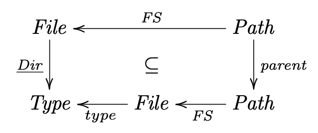 Q1.4 Assuma que, num sistema de ficheiros ($\def\FS{\mathit{FS}}\FS$), cada ficheiro ($\def\File{\mathit{File}}\File$) é acedido por uma única $Path$. O "quadrado mágico" que se segue,